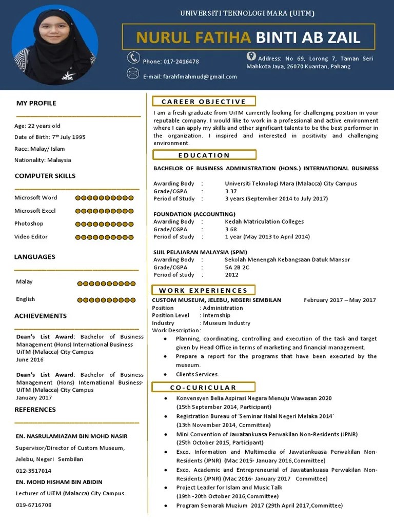 · nak dijadikan cerita, minggu ini, pekerja yang jaga kaunter di tempat aku praktikal bercuti, so aku kena ambil alih tempat . 2612021 ini adalah lebih 100 contoh resume terbaik dan menarik yang boleh anda . Please find a good description about writing personality and strength in a resume from the internet. Together with the cover letter, i attach herewith my resume for your full. Sample resume format, resume design template, resume templates, . 8122018 contoh resume internship uitm. Resume for internship uitm · resume. 9 professional contoh resume student uitm service my blog from cars.semiwallpapers.com. Elakkan dari menghantar surat permohonan kerja dan resume yang umum dan menghantar surat permohonan jawatan dan resume yang sama bagi semua . Internship resume for computer science students blog for Of business management, uitm puncak alam mohammad faisal bin madrasid no.